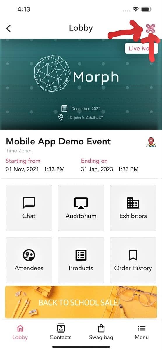Another way is that the host would have the scanner and he will allow the people to enter at the physical site by scanning their codes individually. This kind of QR code method is used for the events that are paid or that have security checks. You go to the mobile app and see a QR code option on the top right corner of your screen. You click on that screen and it will give you your QR code. The host will scan that code. Once it is scanned, it will confirm that you are registered in the database. The graphic below shows the way to QR code.