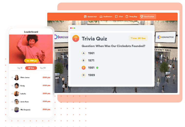 Ignite the competition within your virtual events with virtual leaderboards, scavenger hunts, spin the wheel, and trivia games. Boost attendee engagement and incentivize participation with bragging rights, certifications, or sponsored gifts.