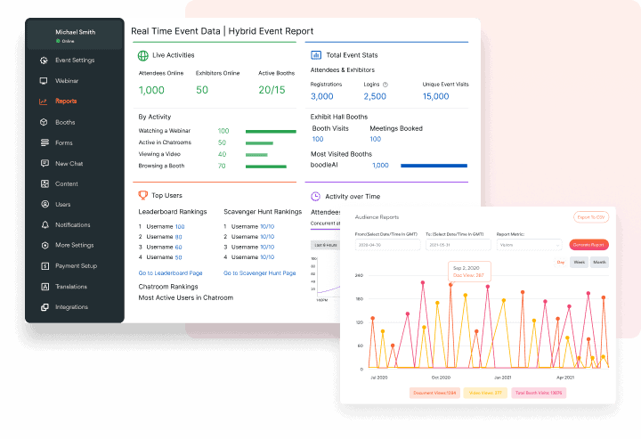 You can track everything that’s happening at your virtual event with event analytics and reporting modules available in vFairs virtual event solution. Get real-time data on event logins and registrations, download event reports, find out what attendees love about your event, and track booth visits. There are separate dashboards for event organizers and exhibitors for easy and direct access to relevant event data.