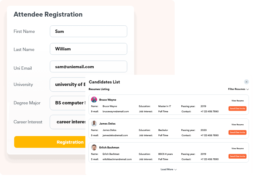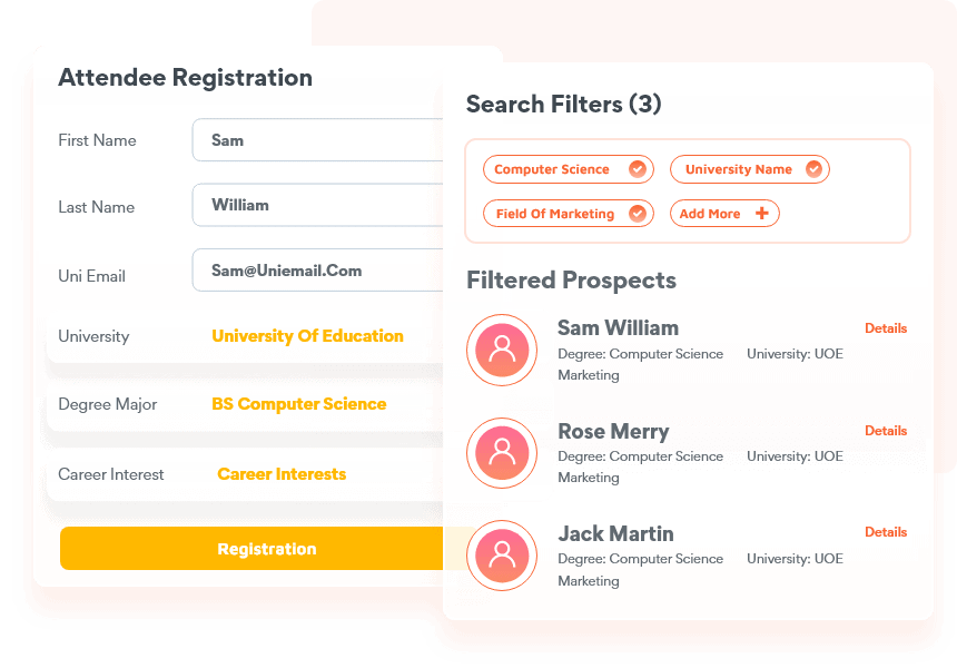 Capture data with a custom registration form to build a student database. School recruiters can then search for prospective students that meet their criteria and reach out.