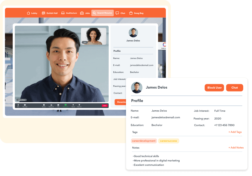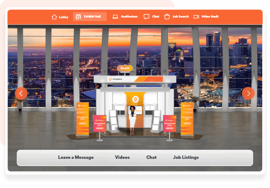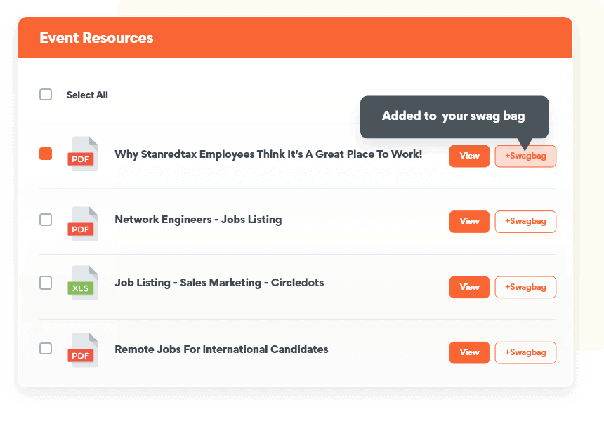 Add open roles and job descriptions to each exhibit booth. Candidates can directly apply to the jobs when they visit the booth. Recruiters can also add resources such as perks and benefits brochures and employee testimonial videos to their booths.