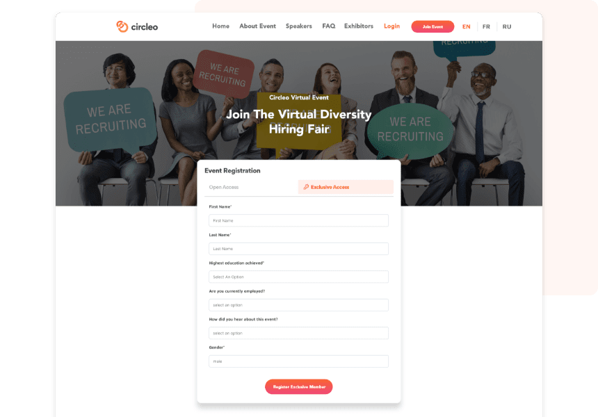 Create a branded landing page for your virtual diversity event with a custom registration form. Capture the candidate data you need to be able to shortlist candidates. Attendees can also upload resumes and supporting documents upon registration.