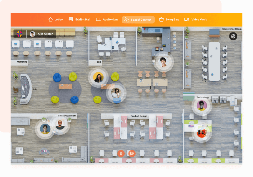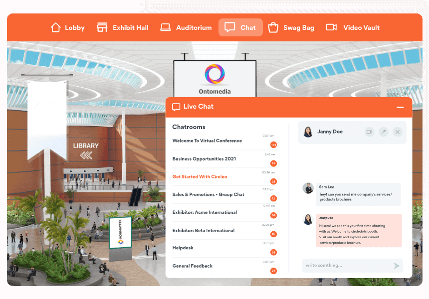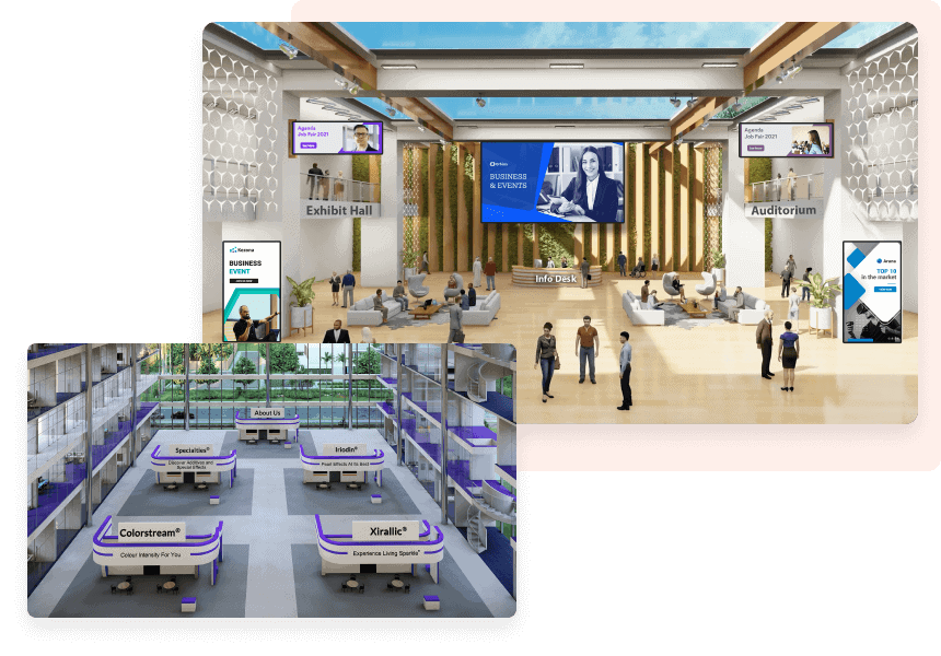Custom-design your virtual lobby, auditorium, networking lounges and more to create an immersive, lifelike experience in a 3D modeled environment.