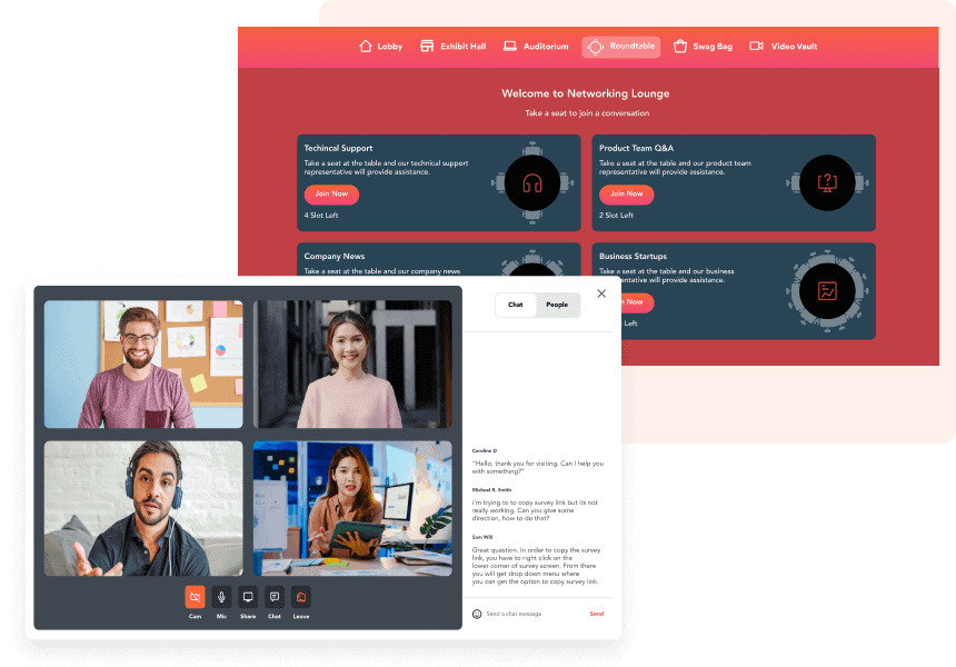 Set up roundtables where users can share ideas about any topic in a small group setting. Allow attendees to discuss important topics and solve problems together via video chat.