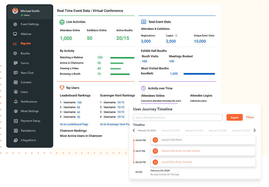Evaluate your event’s performance through in-depth insights, including real-time and post-event metrics, from registrations and logins to virtual ‘footfall’ and document downloads.