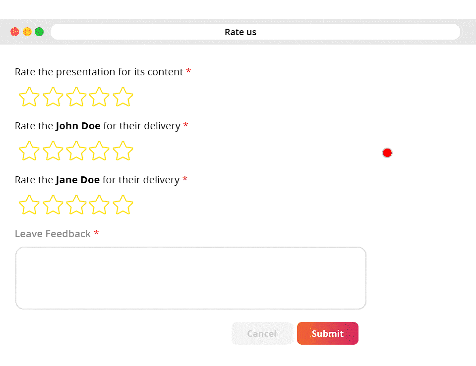 With separate feedback fields for each speaker, attendees can rate individual performances, recognize strengths, and identify areas for improvement. This information will be invaluable for speakers and organizers alike, helping them fine-tune their presentations and speaker choices at future events.