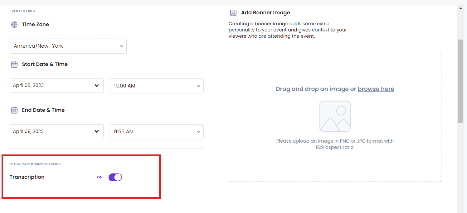 Webinars need to have accessibility features to ensure that all members of the audience can benefit from them. The vFairs embedded webinar offers live transcription to make that possible. Hosts can turn transcription on through a quick and easy toggle within the webinar environment.
