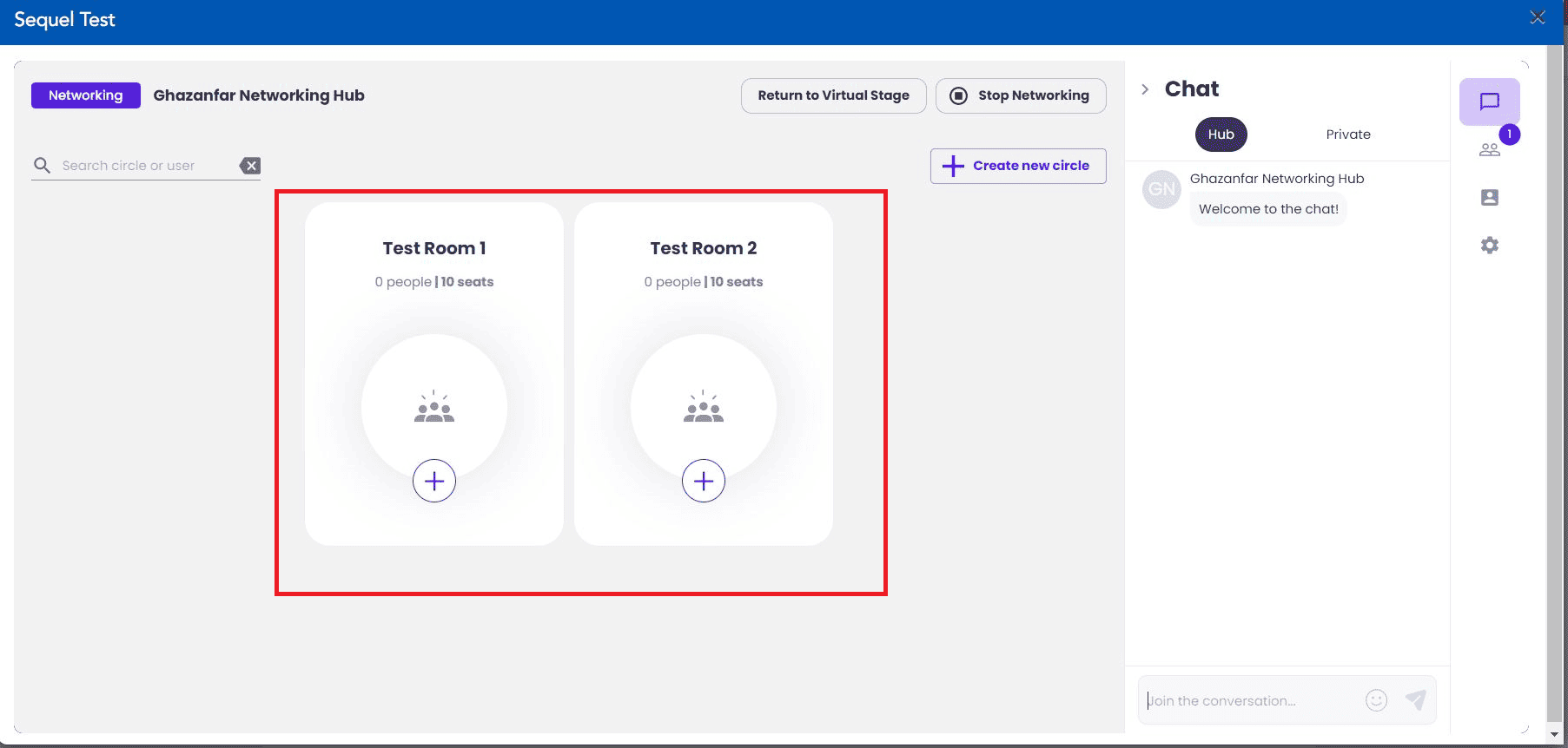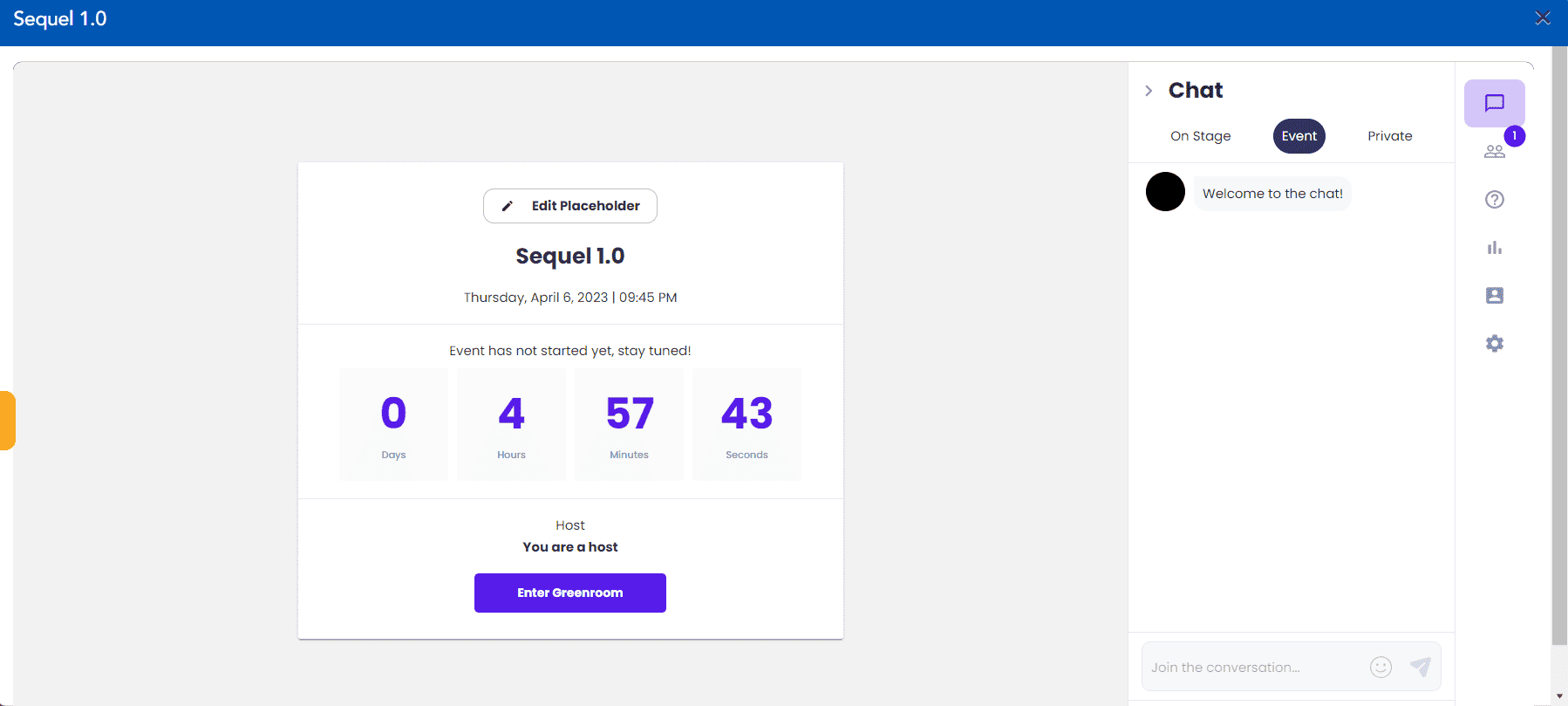 The chat widget has multiple modules: On Stage, Event, and Private. When a host or speaker clicks on stage, they will be taken to the audience’s view of their presentation. The other two modules will have public and 1:1 chat messages respectively.