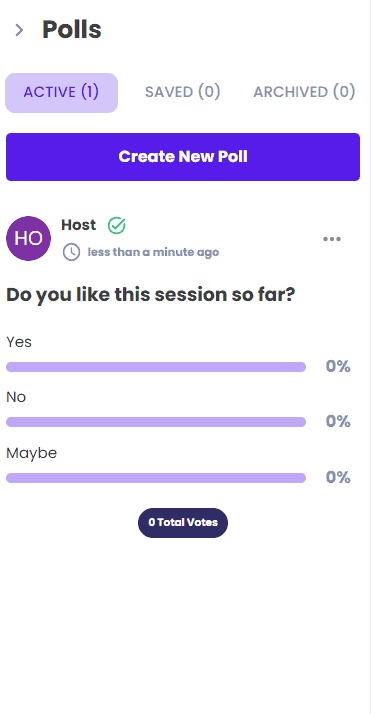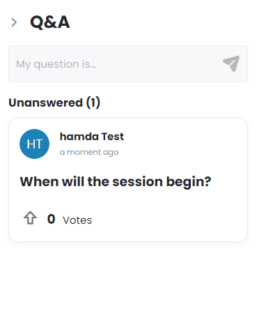 Attendees, speakers, and hosts can connect through chat which is a multifunctional widget on the right-hand side. All private and group chat messages will show up here for each attendee. Moreover, you will also see all currently running polls or answered questions here.
