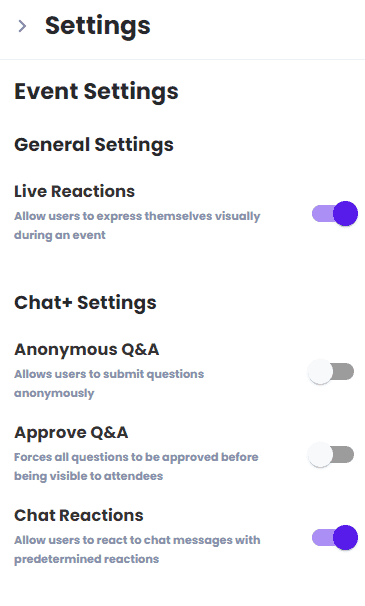 There are different toggles for event settings that can enable or disable chat and reactions. You can also choose to moderate chats and Q&As as well. Only the approved answers and chat will show up for the entire audience. Moreover, you can also allow or disallow audience members to post questions anonymously. This is a great way to provide your audience with some level of privacy.