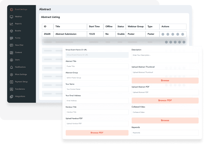 Remove all the fuss from your call to papers process by creating a highly customizable abstract submission form. Authors can upload presentations, abstracts, videos, or other media easily through the form simplifying the entire process.
