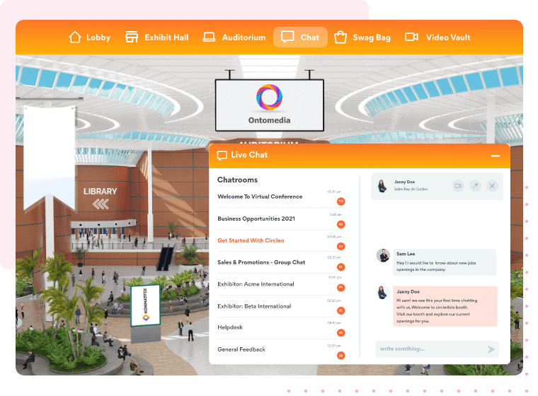 Let booth admins and visitors interact with each other via group and private chat. They can use text, video, and audio formats to connect and network.