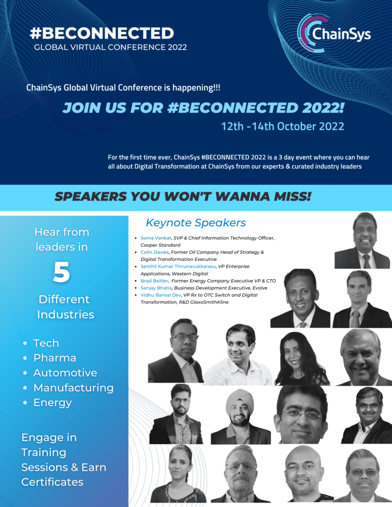 The ChainSys #BeConnected Virtual Conference aims to shape the future of sustainability and will happen from 12-14 October 2022. Interested participants can register here.