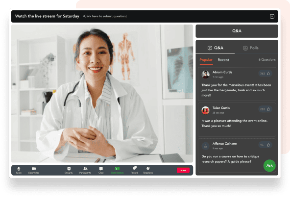 • Leverage an embedded webinar solution with breakout rooms, polls, Q&As, chat, etc.