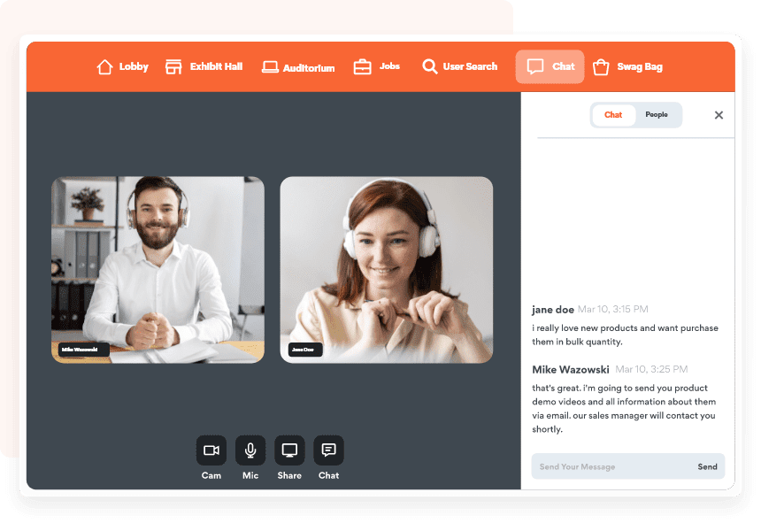 Give attendees and sales reps the opportunity to chat through text, audio or video chat. Let attendees schedule 1:1 meetings with sales reps in order to learn more.
