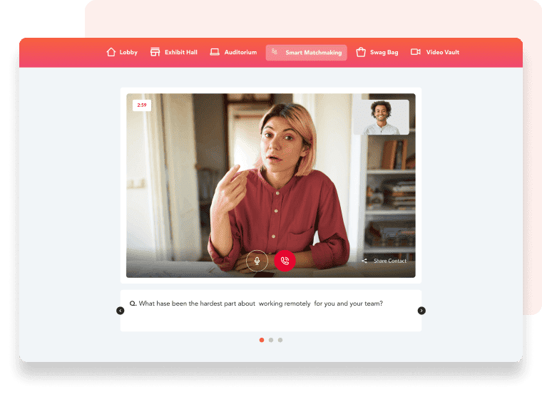 Network 1:1 or in groups through audio, video or chat. Set up roundtables for users to share ideas in a small group setting.