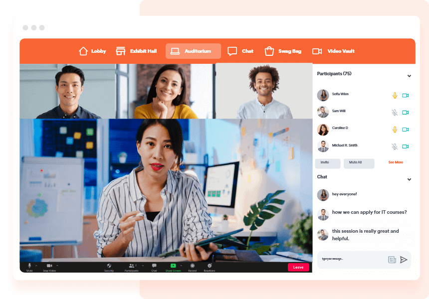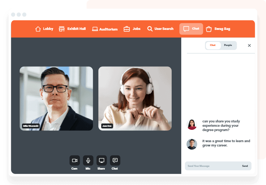 Your alumni can connect over text, audio or video chat within the virtual networking event platform. You can also take your event across channels with our social media wall integrations like Walls.io.